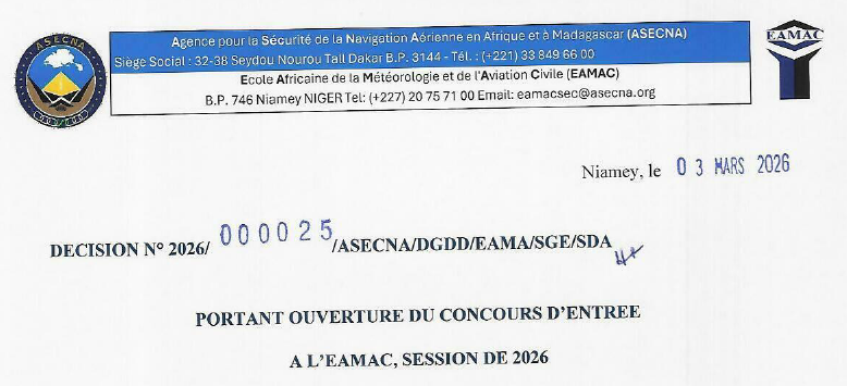 DECISION N° 2026/ 000025/ASECNA/DGDD/EAMA/SGE/SDA PORTANT OUVERTURE DU CONCOURS D'ENTREE A L'EAMAC, SESSION DE 2026 LE CHEF D'ETABLISSEMENT DE L'EAMAC, [...]